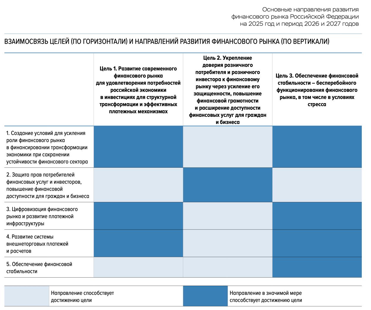 Для тех, кто не готов досконально изучать многостраничный «Обзор направлений развития финансового рынка», ЦБ составил незатейливую табличку с целями и инициативами, которые должны к ним привести. Иллюстрация довольно неконкретная: очевидно, что регулятор видит необходимость всестороннего развития, а мы в своём обзоре остановимся на цифровизации, защите потребителей и адаптации к глобальным изменениям.
