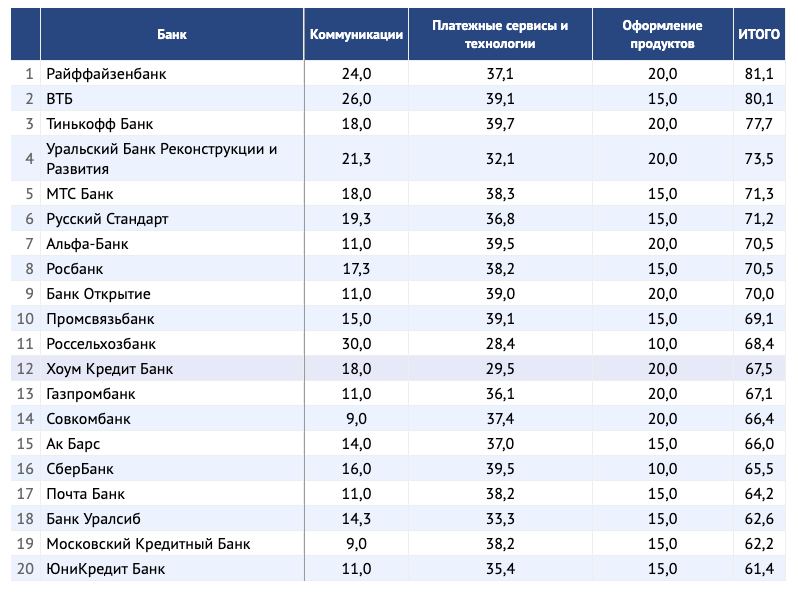 Не то что бы лично мы знали, кто должен быть на первом месте, но «Райф» — это не серьезно. «Сбер», «Альфа», «Тинькофф», ВТБ еженедельно запускают что-то новое, а на первом месте оказыввается банк, про цифровые сервисы которого не слышно практически ничего. И если «Тинькофф» и ВТБ вошли хотя бы в топ-3, то «Альфу» опустили аж на 7 место, а «Сбер» на 16. Коллеги, держитесь, дело не в вас.