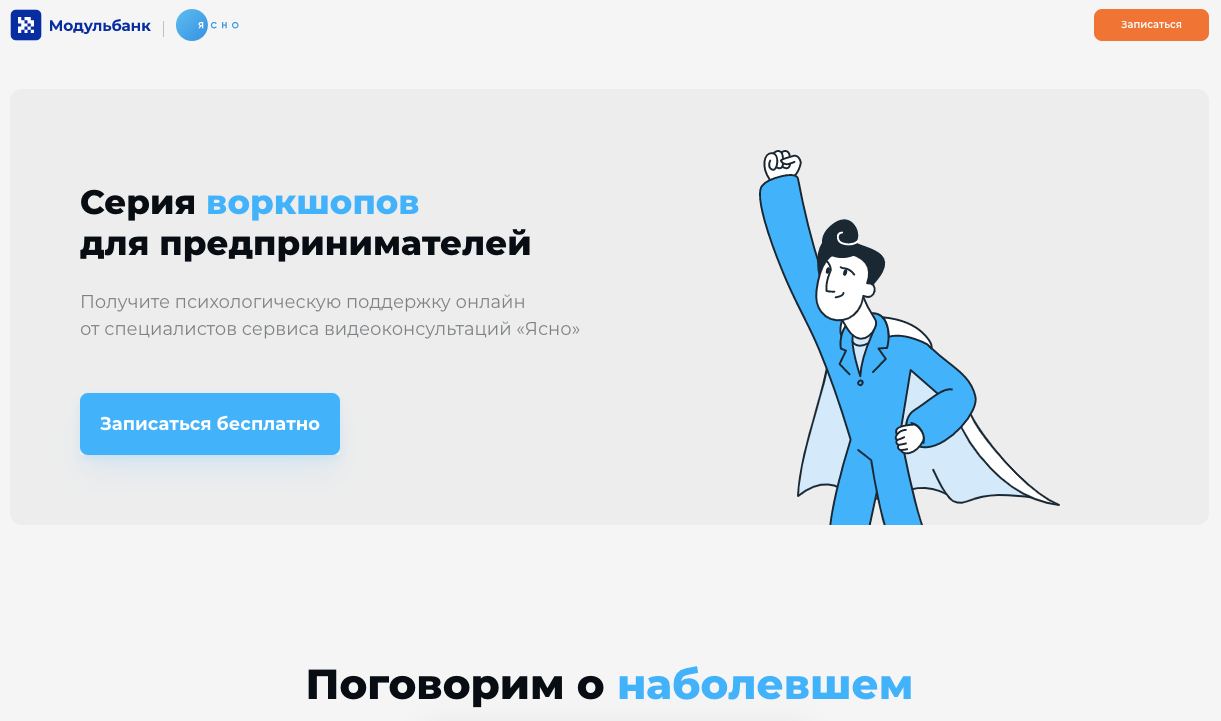 «Модульбанк», о котором очень давно ничего хорошего не было слышно, напомнил о себе добротным пиар-кейсом. Совместно с сервисом «Ясно» банк предложил предпринимателям бесплатную психологическую онлайн-поддержку. Опытные психотерапевты помогут разобраться в причинах проблем и расскажут, как работать с ними самостоятельно.