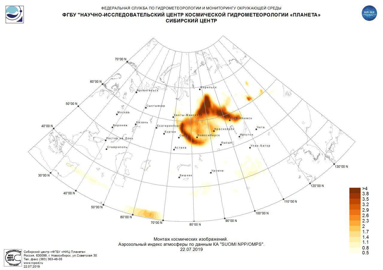 Снимки смога лесных пожаров из космоса 22 июля опубликовал Сибирский центр НИИ космической гидрометеологии «Планета». На них видно, как шлейфы дыма достигли Омской области и полностью окутали воздух над Новосибирской, Томской, Кемеровской областями, Хакасией и Алтаем.