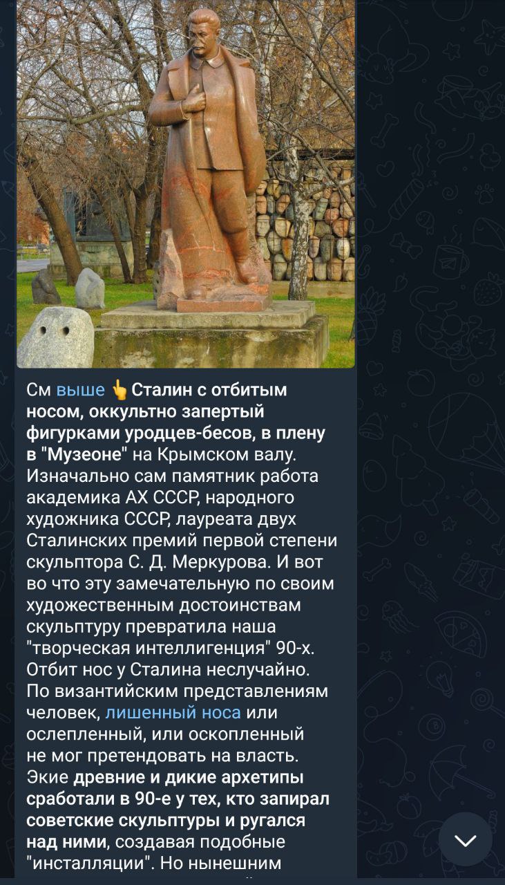 Как знать, быть может тот священник и угадал: очередной проект Меркурова является скопищем «друзей-творцов» – гениев/даймонов сталинизма. Кто его атаковал? Возможно, действительно либеральные волхвы (хотя глазастые камни выглядят симпатичнее Кобы). В таком случае, это типичный буро-бурый конфликт. Им всем определённо нужен экзорцист... Судя по тому, что в последние недели целый ряд телеграмных патриотов открыто восславили Джугашвили, у легиона активность повышена.