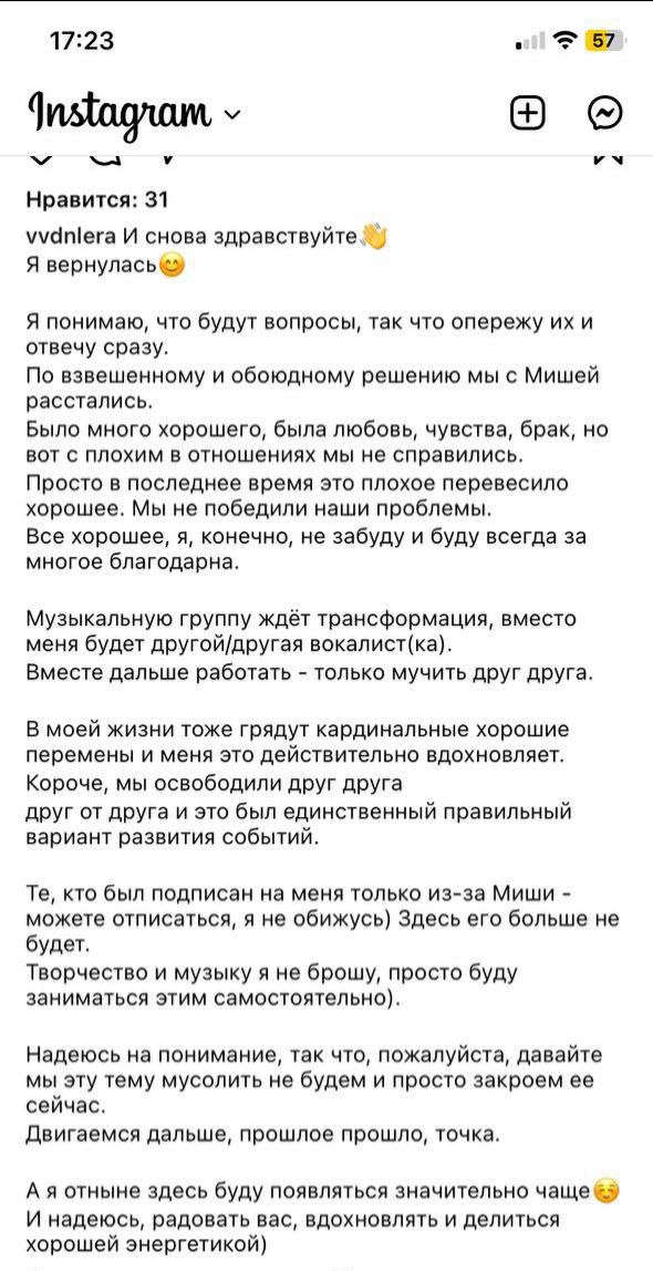 В своём обращении бывшая супруга говорит, что все обоюдно, цивилизованно, и её ждут великие дела и новые проекты.