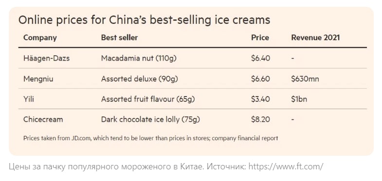 При этом, Mengniu, одна из двух компаний-лидеров молочного рынка КНР, в 2021 году продала мороженого на внутреннем рынке на сумму 4,2 млрд юаней или всего лишь $0,6 млн. На рынке в ближайшие годы резко вырастет конкуренция.