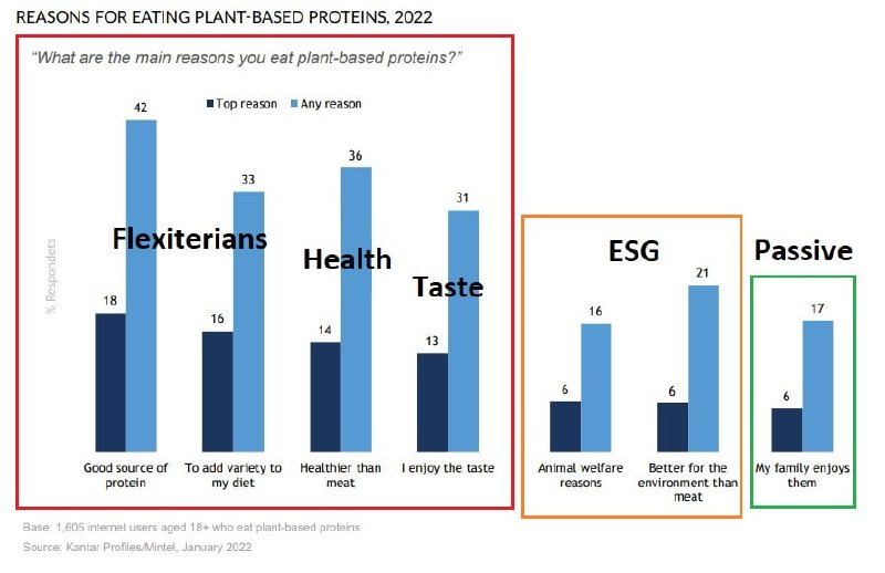 2. Health — 14% просто считают, что растительные белки полезнее для здоровья, чем мясо — докажешь, что оно в чем-то действительно полезнее мяса и подашь это под приятным соусом — получишь 14% рынка.