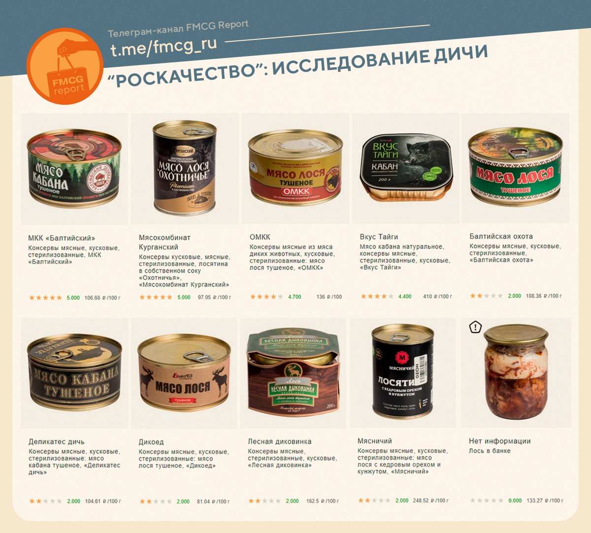 Организация провела закупку консервов из мяса диких животных на крупнейших маркетплейсах, в сервисе "Перекресток Впрок" и на "Авито". Также она приобрела замороженную дичь в специализированных магазинах.