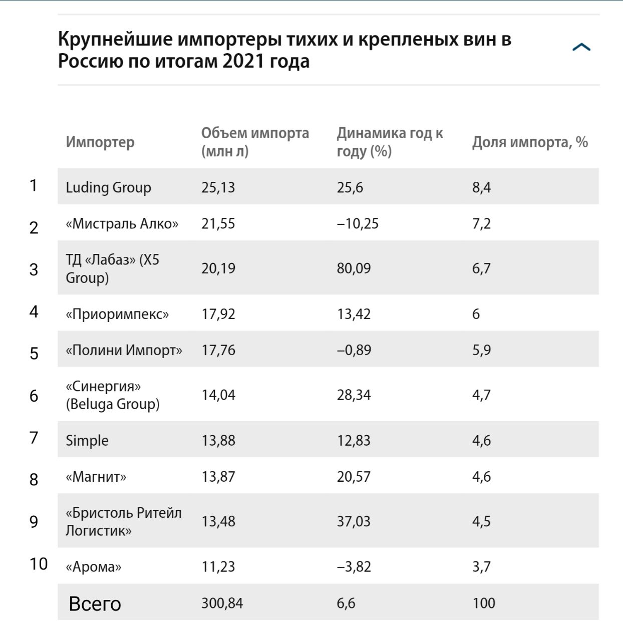 - Всего же импорт тихих и крепленых вин увеличился за год на 6,6% до 300,8 млн л.