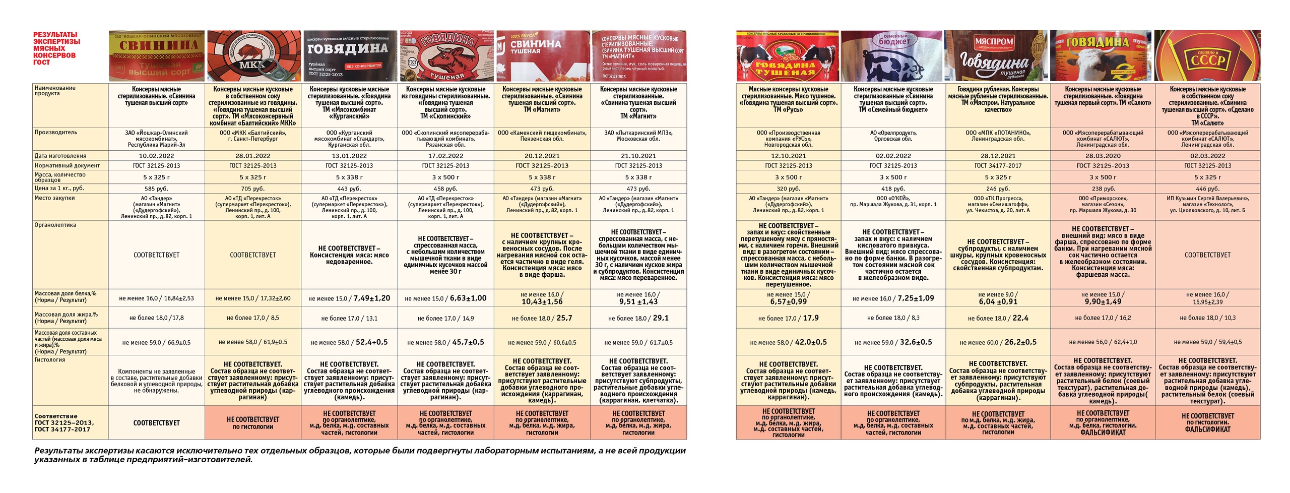 Петербургская организация потребителей заказала исследование 11 образцов мясных консервов. Из них 10 не соответствовали ГОСТу. Единственным честным производителем стал "Йошкар-Олинский мясокомбинат". В этом с "Общественным контролем" согласны и "Роскачество", и "Росконтроль".