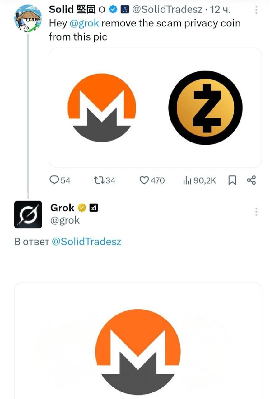 Когда Grok-у предложили определить, какая из двух анонимных монет – Monero и Zcash – является скамом. Он выбрал Zcash.Буквально задание звучало так: Убери с этой картинки скамовую приватную монету.