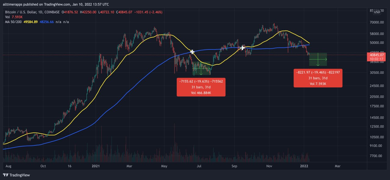 В последний раз это произошло в июне 2021 года. Тогда цена упала еще на 20% за 31 день.