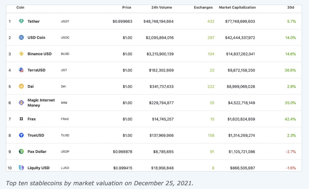 Выпущенная Makerdao стабильная монета DAI выросла на 2,9% в прошлом месяце с оценкой около $8,9 млрд. Стэйблкон TerraUSD (UST) на 9,18% больше, его оценка на момент написания статьи составляла около $9,8 млрд.
