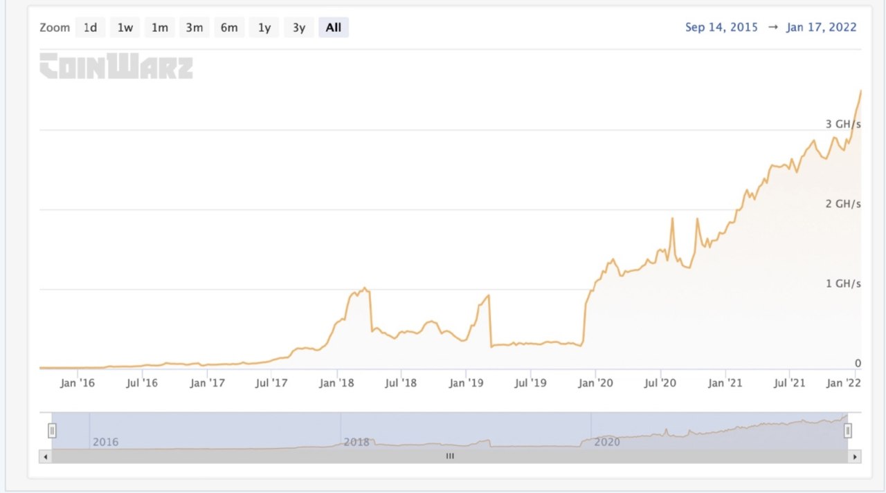 В течение первого месяца 2022 года хешрейты как Биткоина, так и Эфириума поднялись до небывалых максимумов (ATH). Хэш-рейт Биткоина вырос до более чем 200 экзахэшей в секунду (EH/s), хэш-мощность Эфириума подскочила до более чем 1 петахэш в секунду (PH/s). Однако в других сетях, доступных для майнинга, наблюдалось снижение хешрейтов.