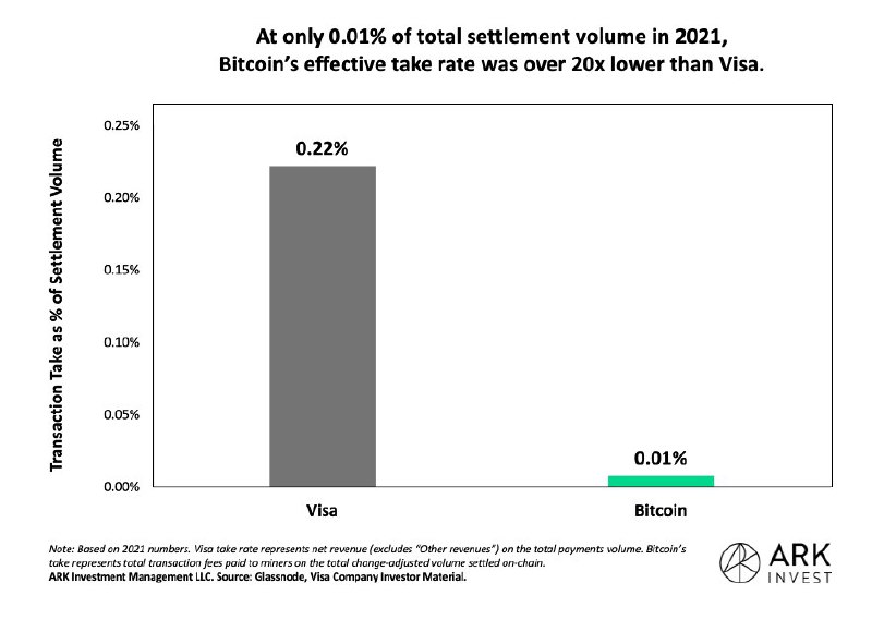 Майнеры биткоина получают всего 1 цент за каждые 100 долларов, переведённые в сети биткоина. Visa взимает 22 цента за каждые 100 долларов, перевод которых она обеспечивает в своей сети. Виза неэффективна и поэтому неизбежно умрёт.