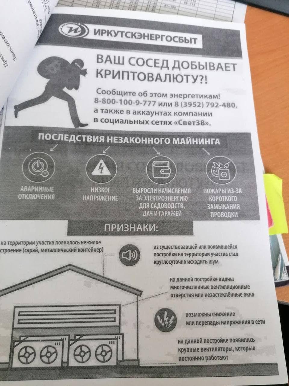 Если вы законно подключены к электросетям, полностью оплачиваете счета за электроэнергию, и увидите где-нибудь такие бумажки, которые уже реально разбрасывают в ящики жителей Иркутской области, пишите жалобы в Прокуратуру, требуйте письменного ответа от Иркутскэнерго, на основании какого закона и по какому праву, компания занимается подобной противозаконной деятельностью?
