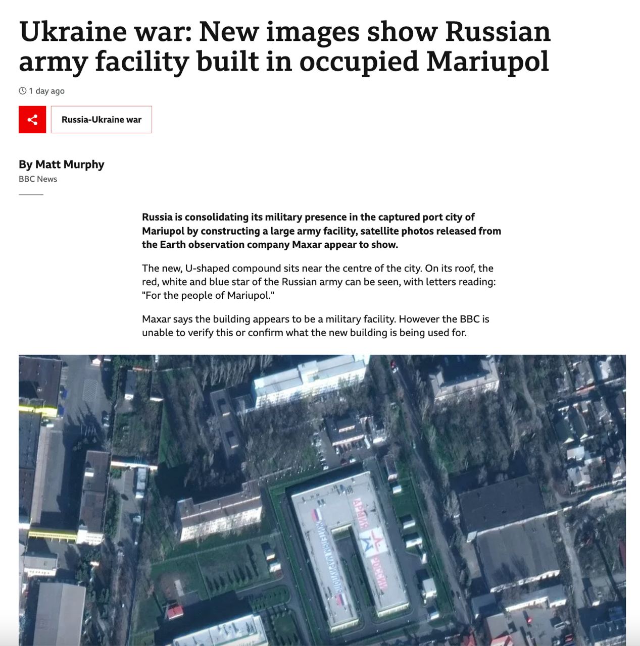 BBC продолжает искать дно журналистики. На этот раз на сайте британского СМИ появилась статья о том, что якобы российские военные построили «военную базу» прямо посреди Мариуполя.