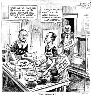 Карикатура, прикреплённая к посту (есть также в комментариях), как раз и отражает конфликт между Гопкинсом и Икесом. На ней изображён Икес, жалующийся на использование его ресурсов (символизируемых «тестом» на кухне), в то время как Гопкинс защищает свои действия. Рузвельт, выступая в роли миротворца, пытается их примирить. Общий смысл карикатуры заключается в демонстрации напряжения и соперничества между различными программами «Нового курса», а также в попытках Рузвельта сбалансировать их усилия ради общей цели.