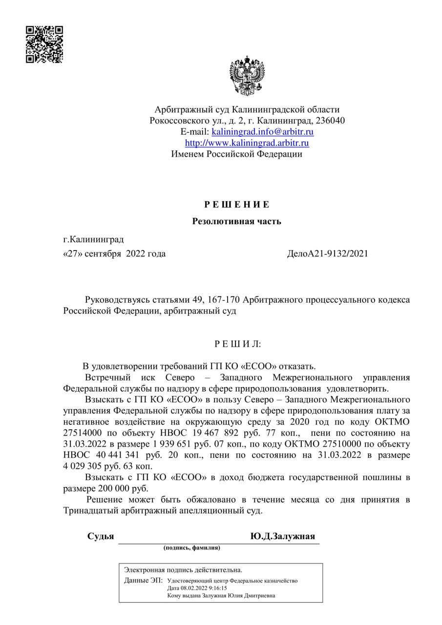 Однако главу Росприроднадзора Светлану Радионову просто так не проведешь: после пересчета цифр в (по сути липовых) документах ЕСОО обнаружилась недоимка по плате НВОС за 2020 год в размере почти 60 миллионов рублей. Уже в суде к этой сумме приплюсовалось еще почти 6 миллионов пени, а также 200 тысяч рублей госпошлины.