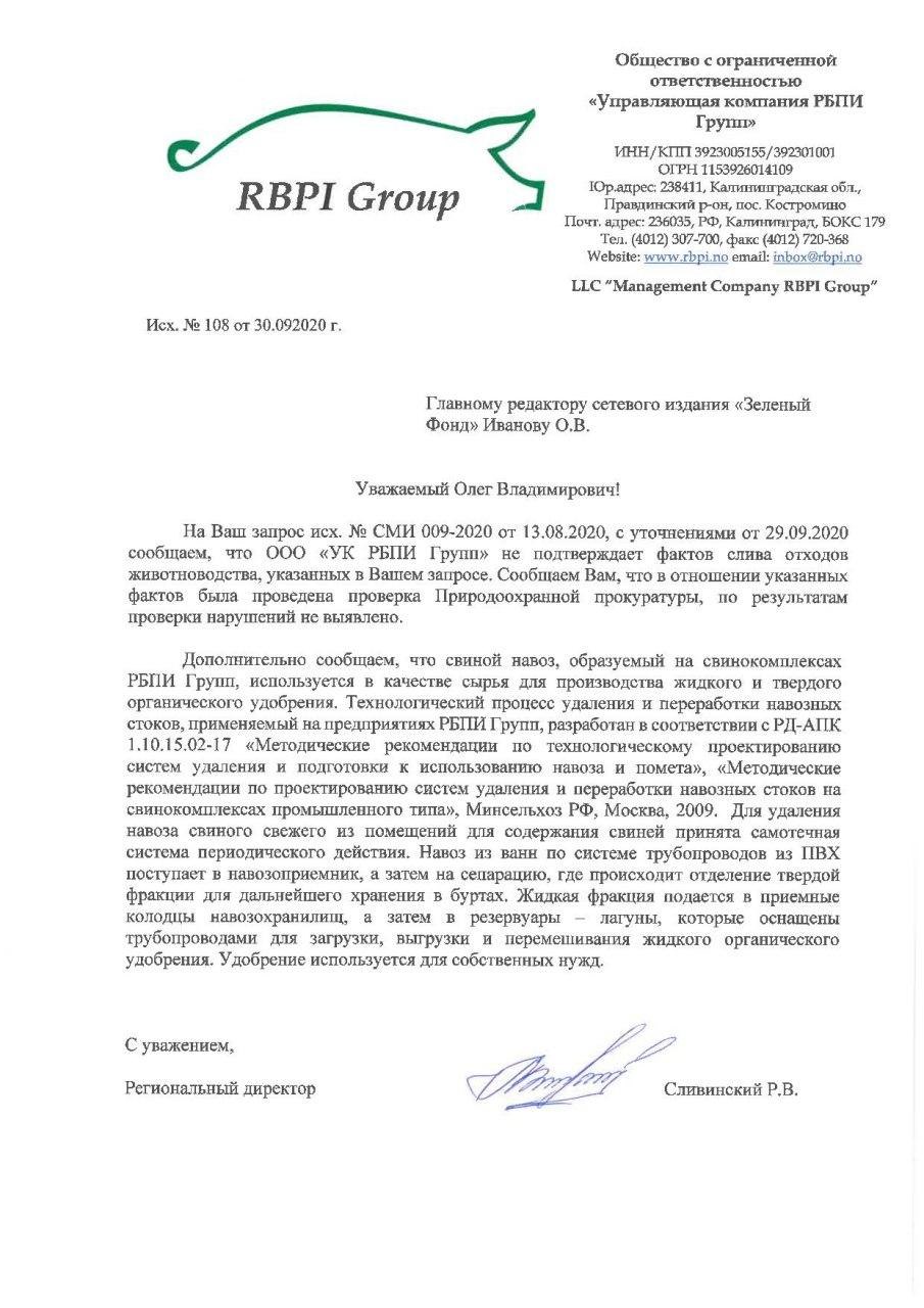 ▪️Однако региональный директор RBPI Group Роман Сливинский в ответе на запрос «Зелёного фонда» сообщил, что в отношении указанных фактов (слива навоза) была проведена проверка Калининградской межрайонной природоохранной прокуратуры, по результатам которой нарушений не выявлено. Эту информацию нам подтвердили в прокуратуре.