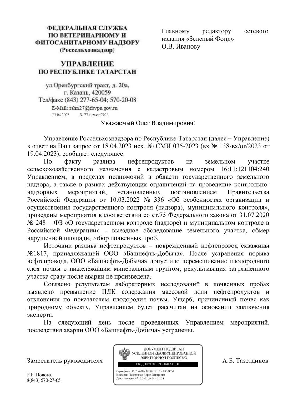 В связи с допущенными нарушениями, Россельхознадзор провел отбор почвенных проб, на загрязненном земельном участке 16:11:121104:240. По результатам исследований было выявлено превышение ПДК содержания массовой доли нефтепродуктов и отклонения по показателям плодородия почвы. Ущерб, причиненный почве как природному объекту, будет рассчитан на основании заключения эксперта.