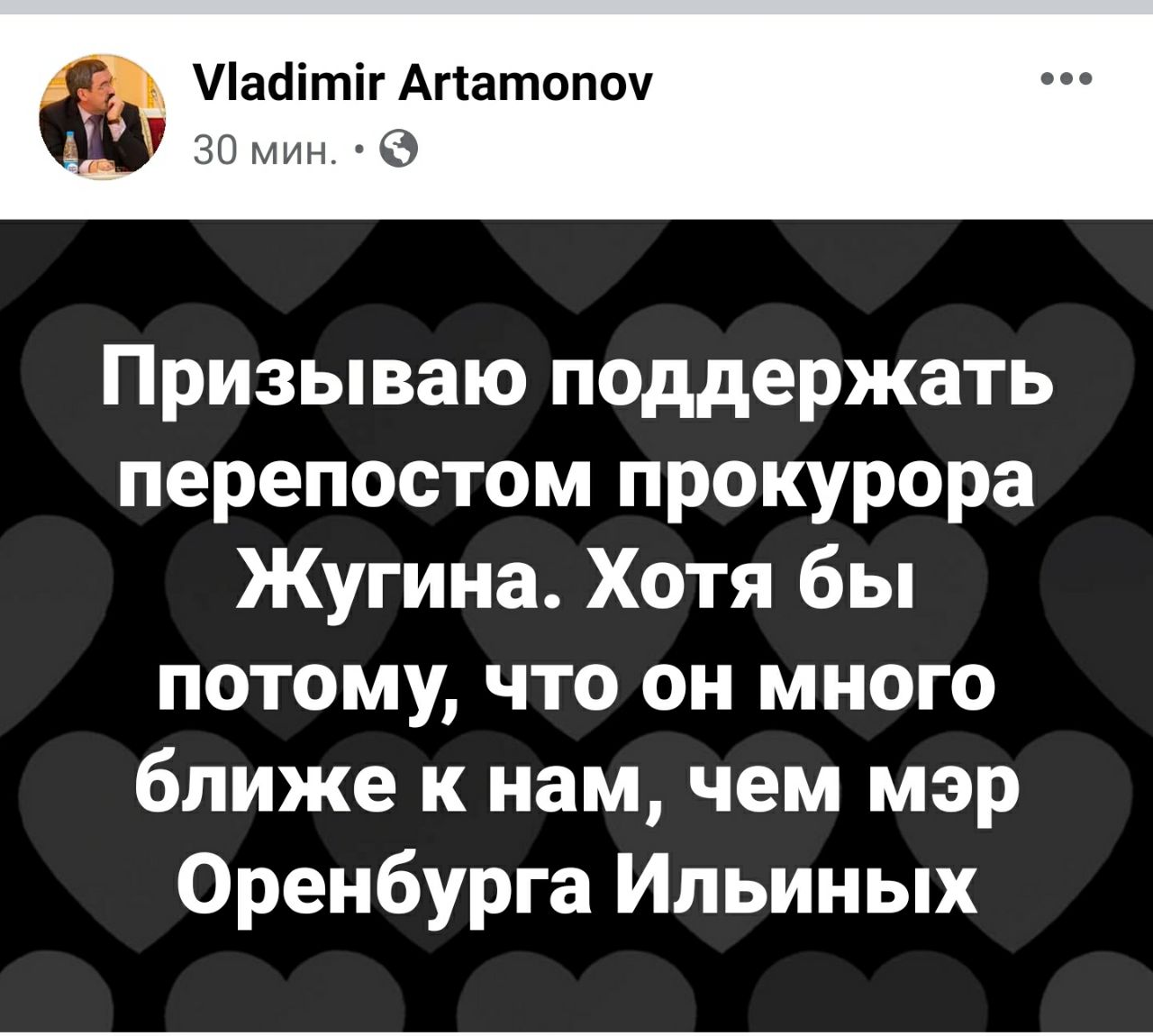 Юрист Владимир Артамонов в своем фейсбуке призвал устроить челлендж в поддержку прокурора Оренбурга Андрея Жугина.