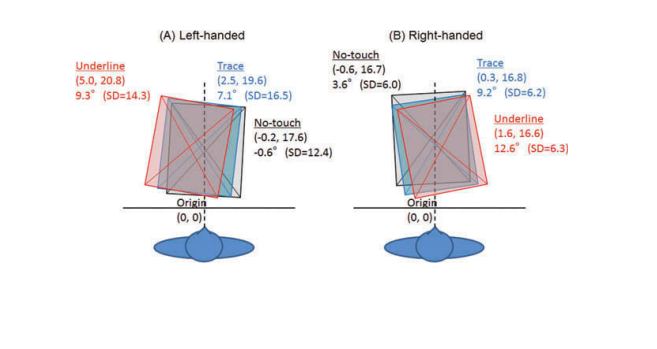 Эксперименты Шибуры были спроектированы на нескольких группах респондентов: левшах и правшах, а также японцах и англофонах. Респонденты поворачивали текст по часовой стрелке, если левша, и против часовой стрелки, если правша относительно их средней линии. В среднем они поворачивали текстовые документы больше при чтении аннотации (около 10 °), чем при чтении основного текста (около 5 °). Разницы в угле документа не было найдено между японскими и английскими текстами. Правши читают текст документа быстрее, когда они поворачиваются между –10 ° и 20 ° против часовой стрелки. Все участники расшифровывают текст быстрее, когда документы поворачиваются на 10 ° против часовой стрелки.
