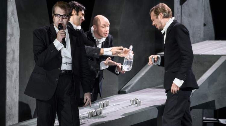 Не перестаю восхищаться сценографией. Рощинская монументальность уже который раз повергает меня в какой-то священный трепет в сочетании с неуверенными смешками от вмонтированного в бетонные стены плеера, домофона и жалюзей. Серое пространство «Отелло» напоминает то ли крепость, то ли храм, то ли «Confession» из Vampire: The Masquarade, то ли всё сразу. Есть и занятные нюансы на уровне домыслов – Дездемону окружают непреступные стены, у Отелло пространство изменяется от агарофобии до клаустрофобии, у Яго вообще показывают изнанку стен, изначально помещая его на лестницу выше остальных. Уж что-что, а смотришь на рощинскую сцену всегда с открытым ртом. Финальная сцена с её зловещей, как в море, симметричностью тел, висящими с потолка тушами свиней и телом Дездемоны и внезапными выстрелами выглядит особенно монументально, и болтовня шута не может сбить этого торжественного грязного пафоса.