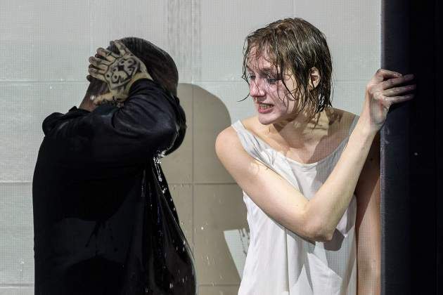 Отдельная благодарность от меня за то, что версию Дездемоны поставили первой – с её точки зрения ВООБЩЕ непонятно, что случилось, почему это всё на неё валится, чем она это заслужила и как это исправить. Часто Дездемону делают жертвенной, хрупкой, покорной, печальной до невозможности, трепетной такой ланью – местная же Дездемона боевая, сильная, как-то по-детски обиженная до слёз, бросающая Отелло вызов своими закономерными вопросами, претензиями – с криками и настоящей борьбой на полу мокрой душевой кабины. Эта Дездемона-воин полна горькой, беспробудной любовью, но будет биться до последнего дыхания – не столько даже за себя, сколько за свою идеальную жизнь с любимым человеком, пусть он и пытается убить её борцовским захватом.