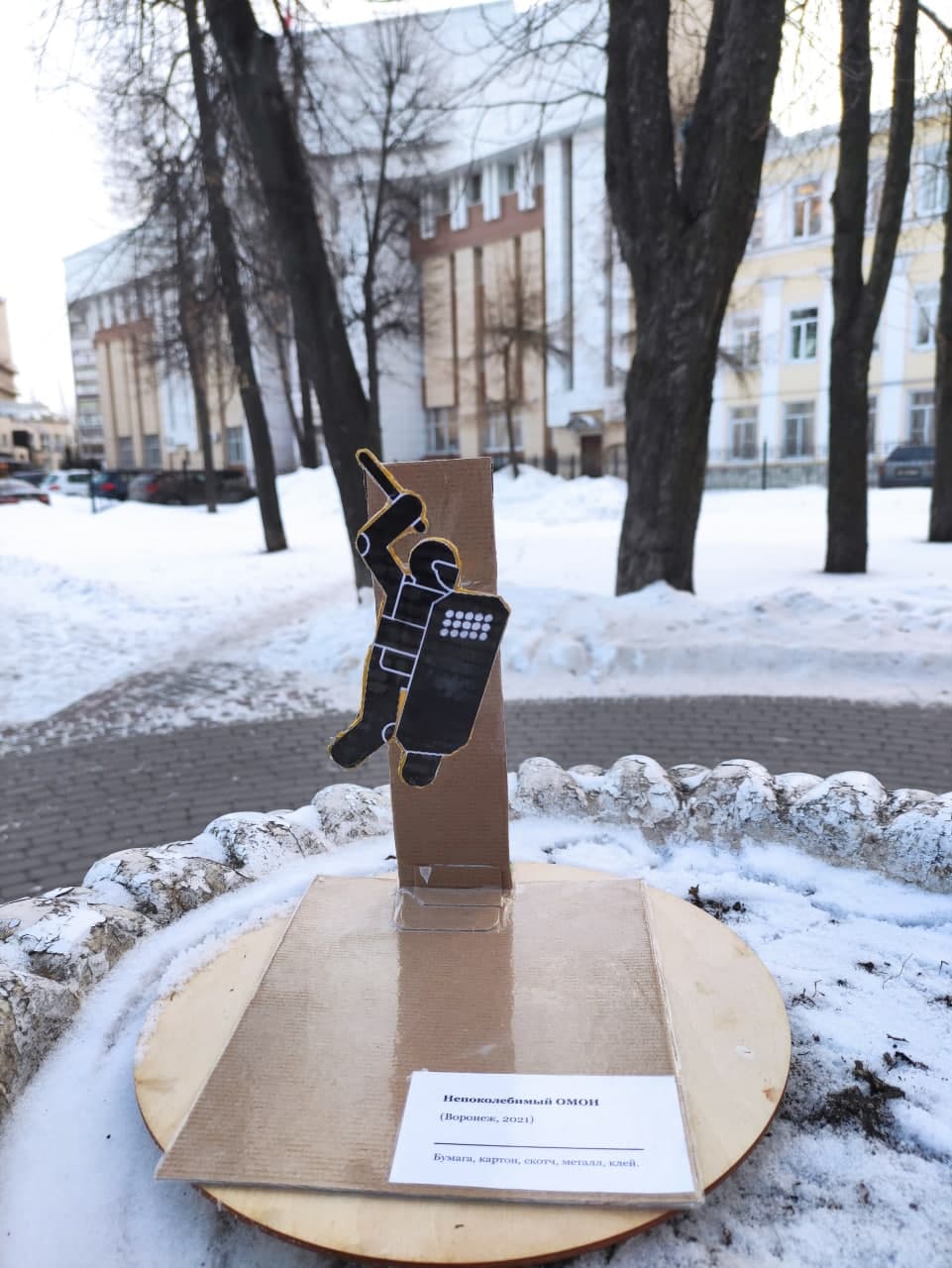 В Воронеже появился «Непоколебимый ОМОН». Нет-нет, не люди в жилетах и запотевающих случайно шлемах, а картонная инсталляция. Ее фотографию и описание прислали в редакцию «7х7» сами авторы, которые пожелали остаться анонимными.