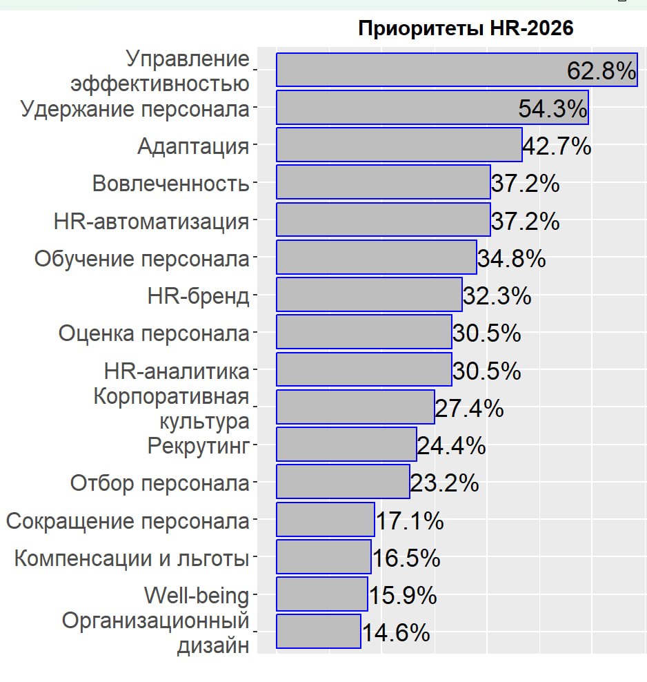 Помните наше исследование приоритетов HR? Если смотреть на средние значения, кажется, что всё «среднее по больнице». Но самое интересное — не в отдельных цифрах, а в том, какие приоритеты выбирают вместе (т.е. Удержание выбирают чаще с ...., Вовлеченность с ... и т.п.).
