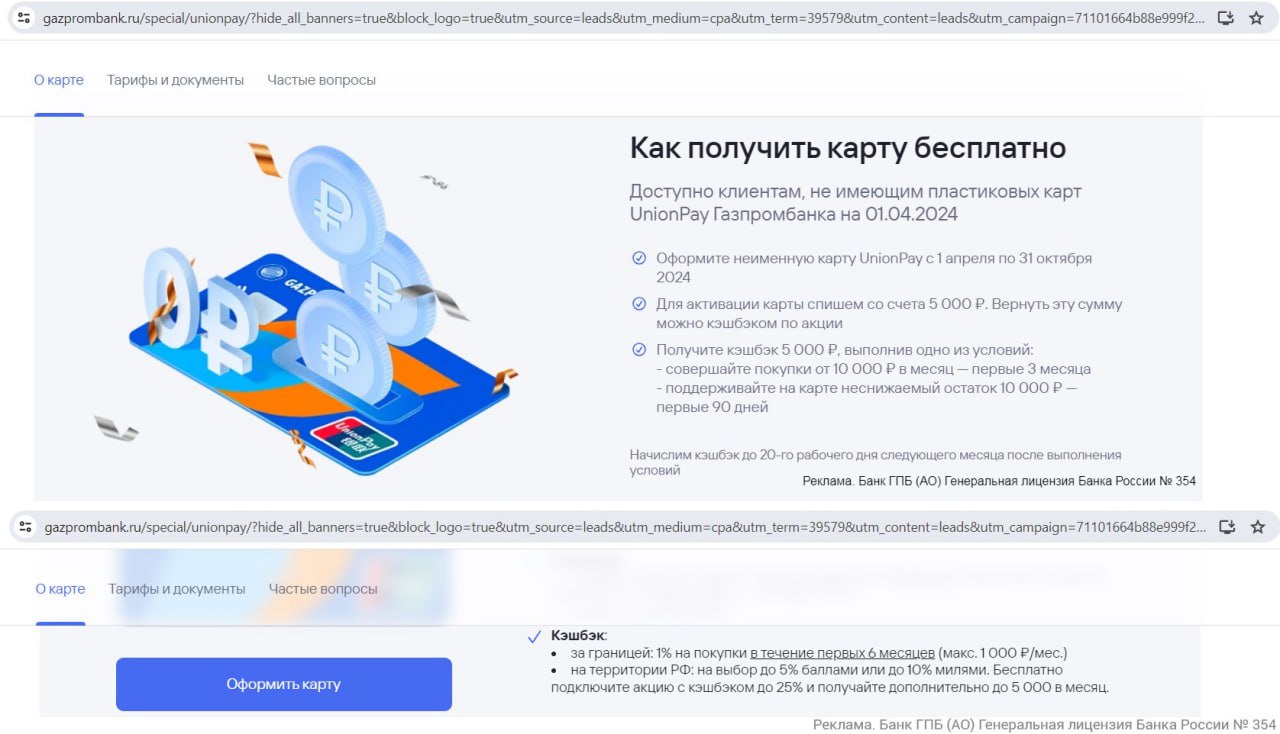 • Если оформить кредитную карту UnionPay "180 дней" от "Газпромбанка" по этой ссылке до 30.04.24, то первый год обслуживания будет бесплатным (со второго года — 3490 руб./год.).