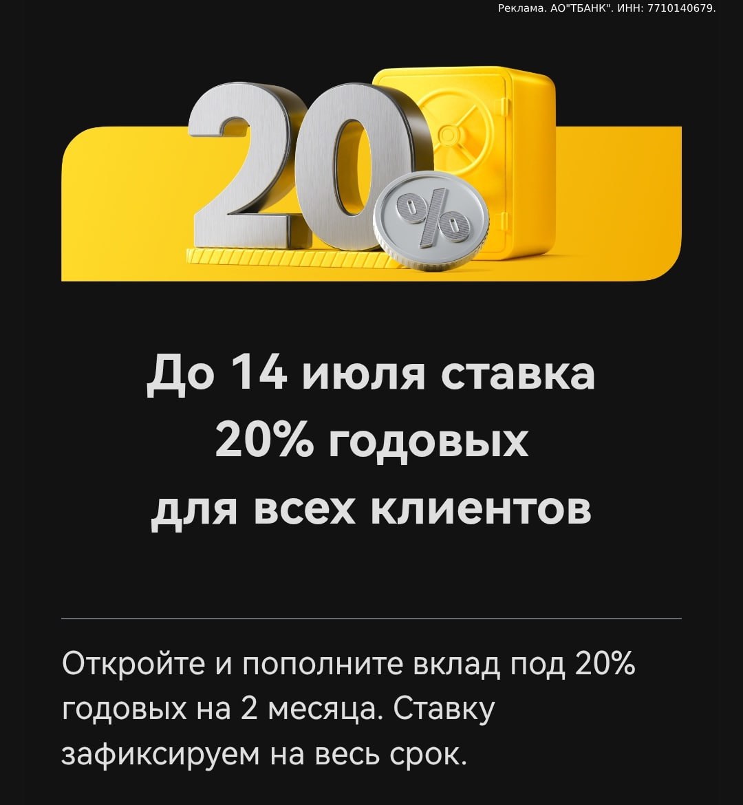 Насчёт снижения ставок по двухмесячному непополняемому вкладу (но который можно пополнять в первые 30 дней) "Т-Банка" под 20% годовых есть три мнения: • Ставки снизят с 14.07; • Ставки снизят с 15.07; • В чате поддержки "Т-Банка" говорят, что у них вообще…