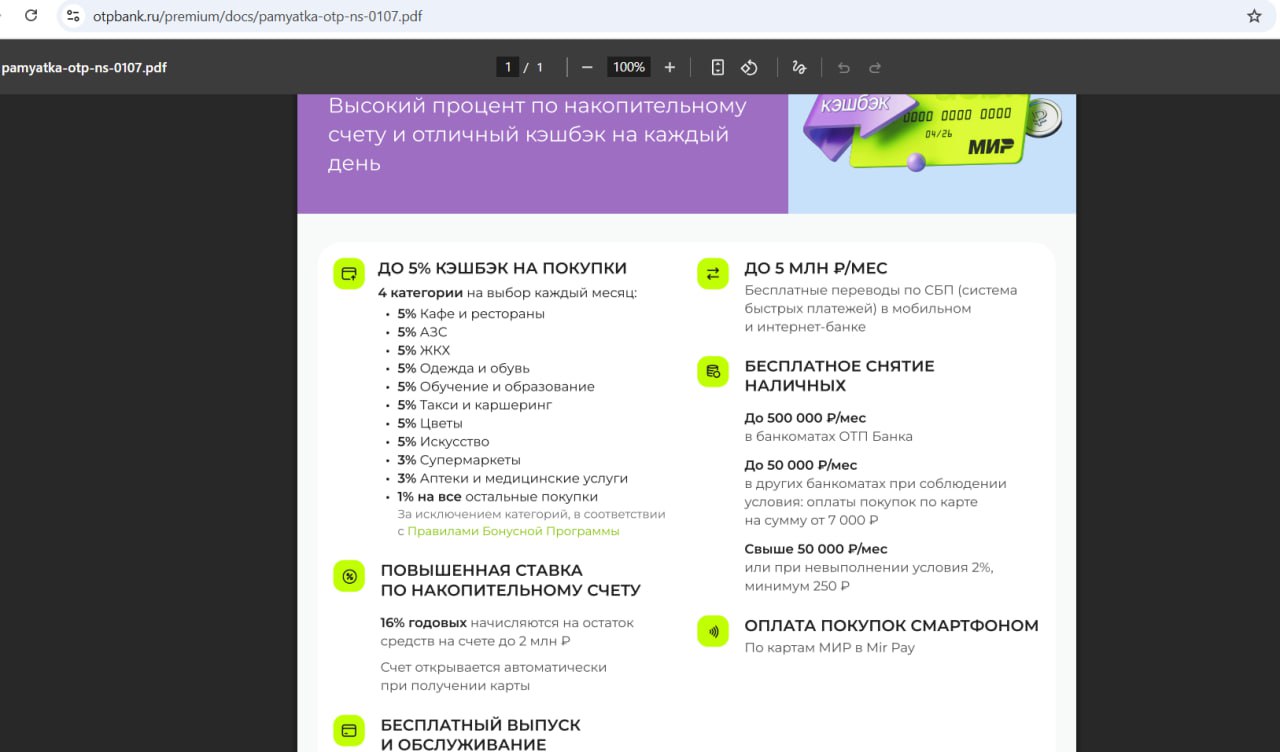 ▶️ В банке действует акция "Приведи друга": если заказать "ОТП Карту" по этой ссылке и в первые 30 дней потратить от 3000 руб. (кроме списка исключений), то банк подарит 500 руб. (на открывающейся странице нужно нажать на стрелку/свайпнуть, чтобы перейти от кредитки к дебетовой карте). Акция для тех, кто в течение 6 месяцев не получал бонус за оформление ОТП Карты по этой акции, подробные условия тут.