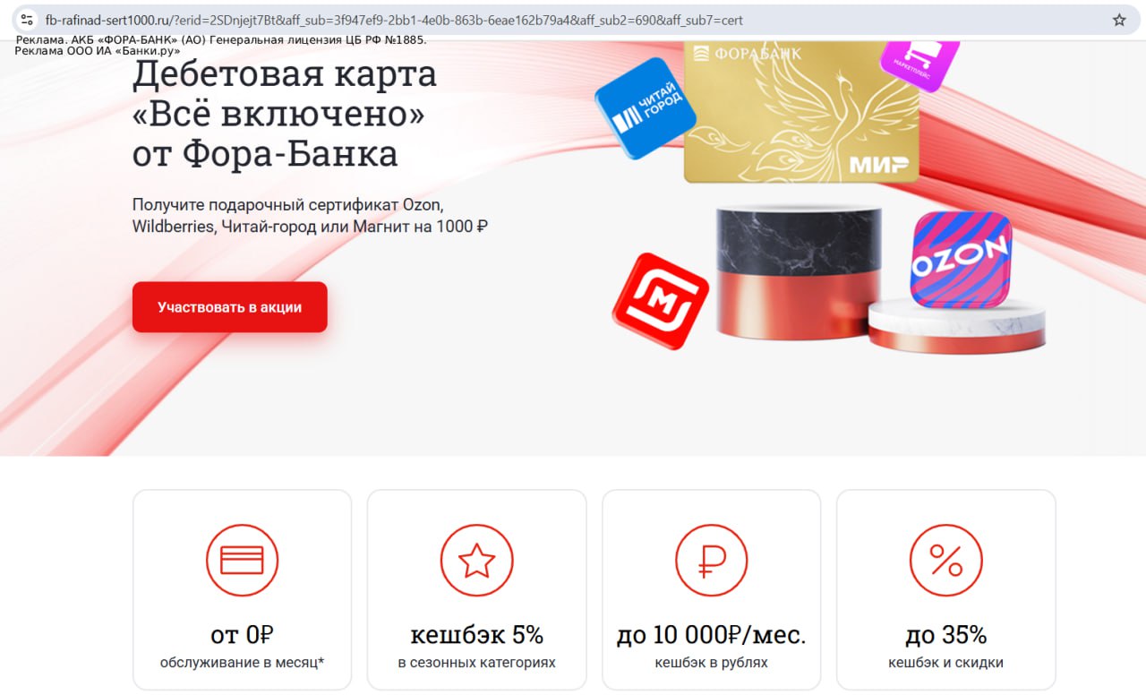 Если заказать дебетовую карту "Всё включено" от "Фора-Банка" по этой ссылке до 30.09.25 и в первые 60 дней сделать покупку от 500 руб., то в подарок будет предоставлен сертификат на 1000 руб. в OZON/WB/Читай Город/Магнит.