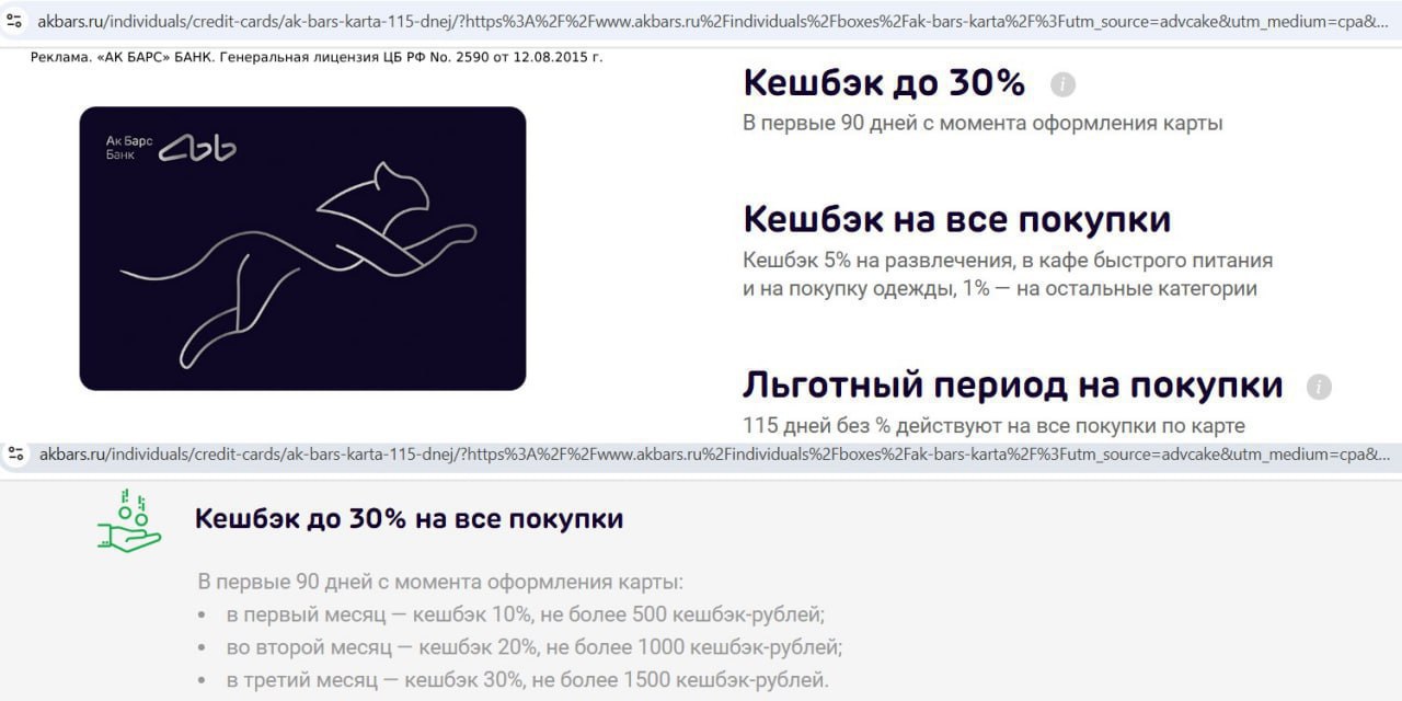 Бесплатная кредитка с грейсом "115 дней без %" от "Ак Барс Банка" с кэшбэком до 30%. Одна из немногих карт с честным длинным льготным периодом (ещё такой есть у кредиток Сбера и ОТП).
