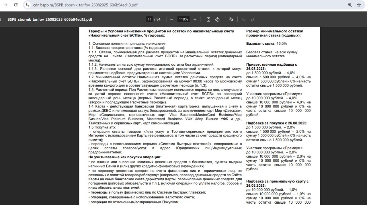 По "Накопительному счету БСПБ" положено 19% годовых новичкам в первые 2 календарных месяца на минимальный остаток за месяц до 1,5 млн руб. (до 10 млн руб. для клиентов "Премиум") при тратах от 20 000 руб./мес., потом, а неновичкам сразу, при таких тратах 17% годовых на мин. остаток до 1,5 млн руб. (18% на "Премиуме" на ост. до 10 млн руб.).