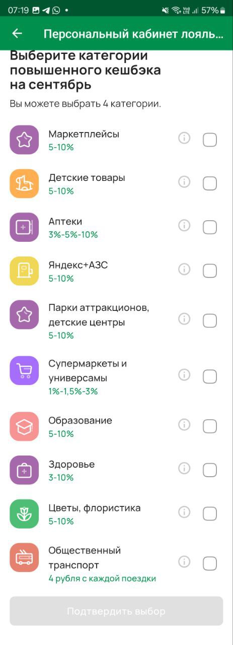 По картам "Примсоцбанка" доступен выбор любимых категорий на сентябрь (4 шт.). У всех одинаковый набор.