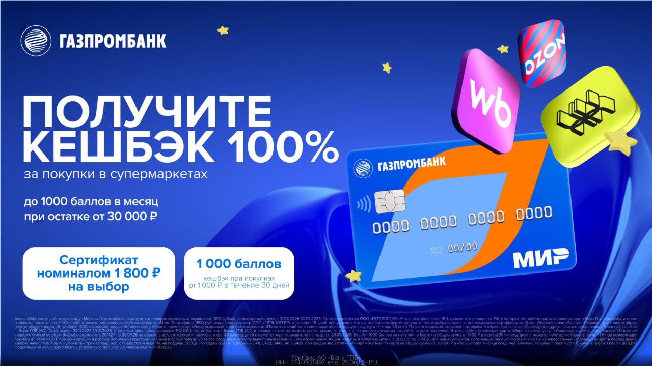 ▶️ Получить сертификат на 1800 руб. + 1000 баллов за бесплатную карту Газпромбанка с кэшбэком 100% в супермаркетах