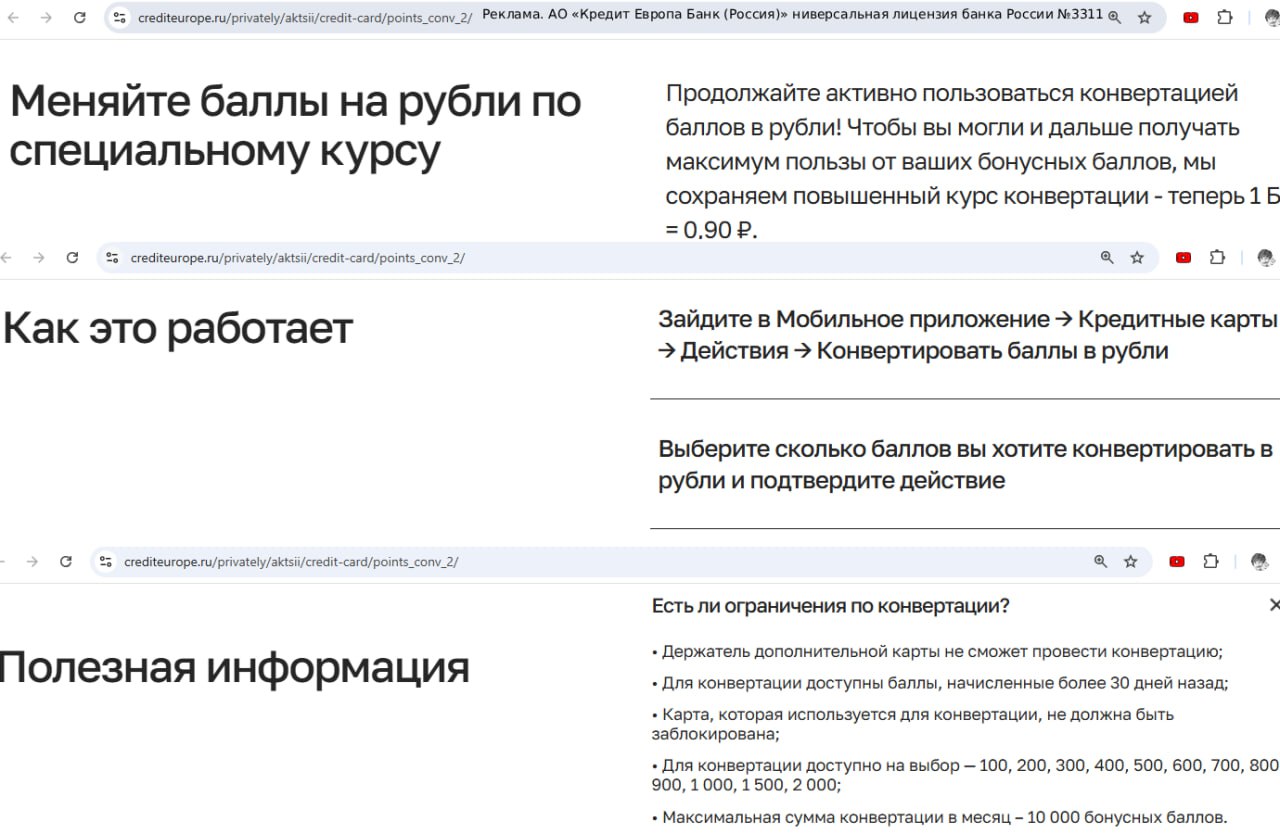 Конвертация баллов напрямую в рубли по кредиткам "Кредит Европа Банка". Запустили новую акцию с менее выгодным курсом перевода.