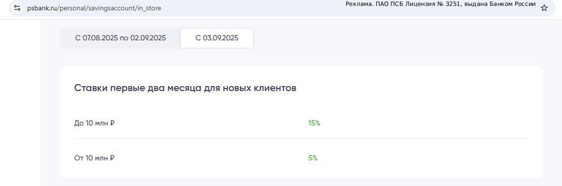 Сегодня (02.09.25) последний день, когда новички в "ПСБ" могут открыть накопительный счёт "Про запас" по старым условиям — под 17% годовых (с 03.09.25 будет 15% годовых) на минимальный остаток до 10 млн руб. в первые 2 расчетных периода (ставка зафиксирована на это время).