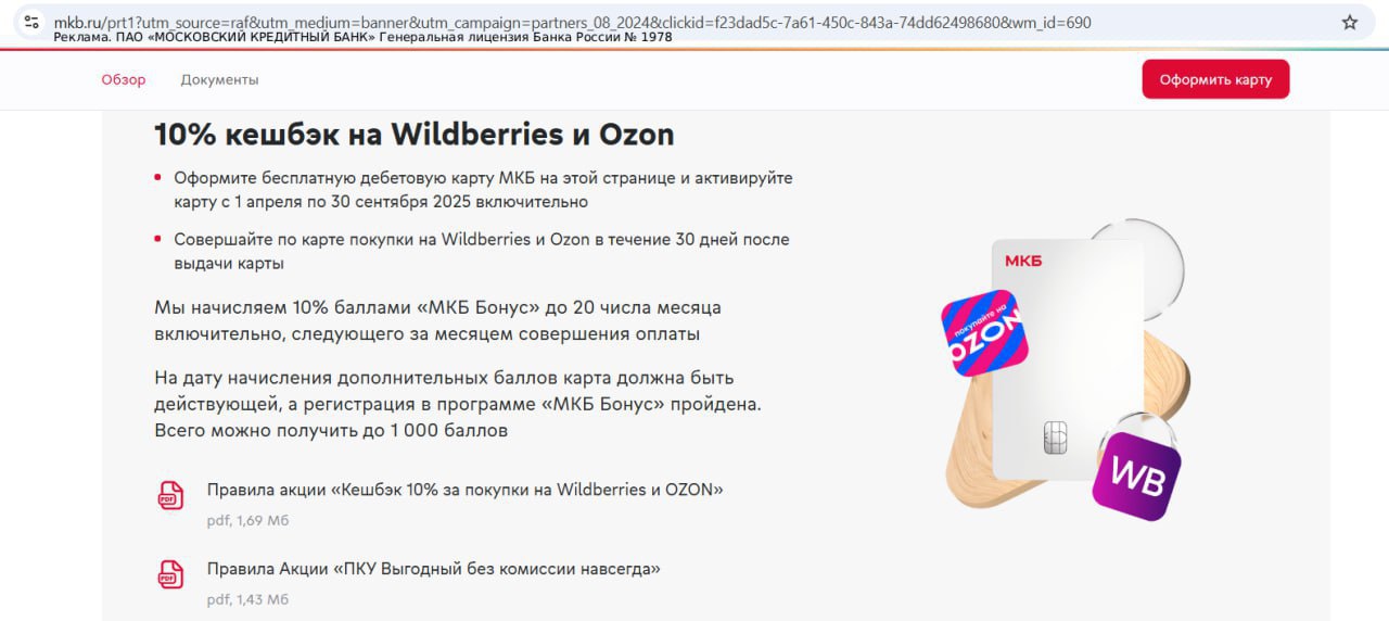 ▶️ Получить бесплатную карту "МКБ" с кэшбэком 10% в OZON и WB.