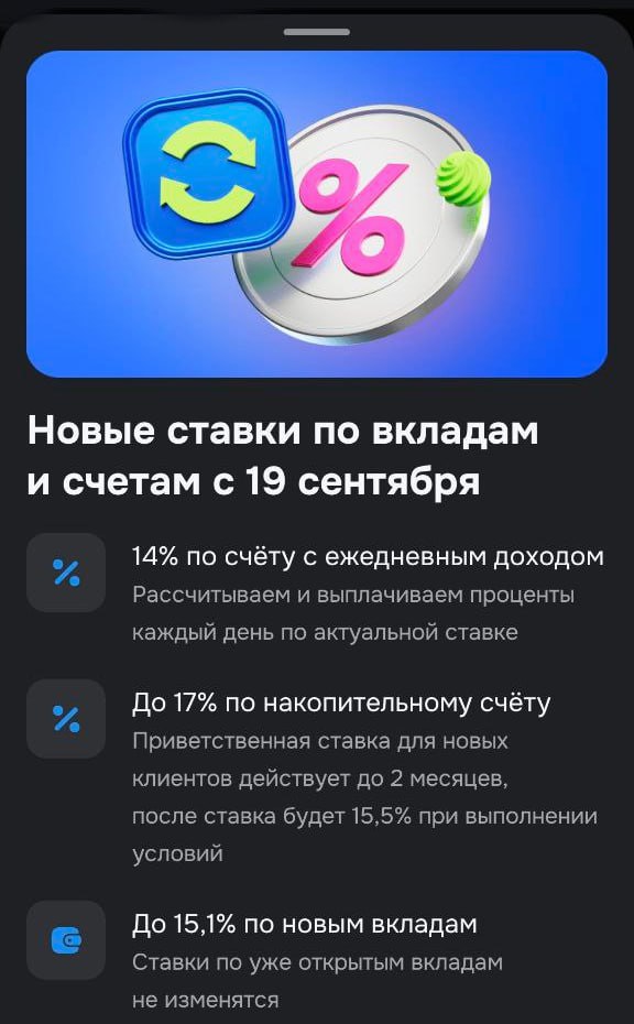 "Яндекс Банк" с 16.09.25 снизит приветственную ставку для новичков по накопительному счету "Сейв" до 17% (-2%) годовых (действует в первые 62 дня) на ежедневный остаток до 30 000 000 руб., за рамками приветственного периода станет 12% (-1%) годовых. Повторно новичком не стать.