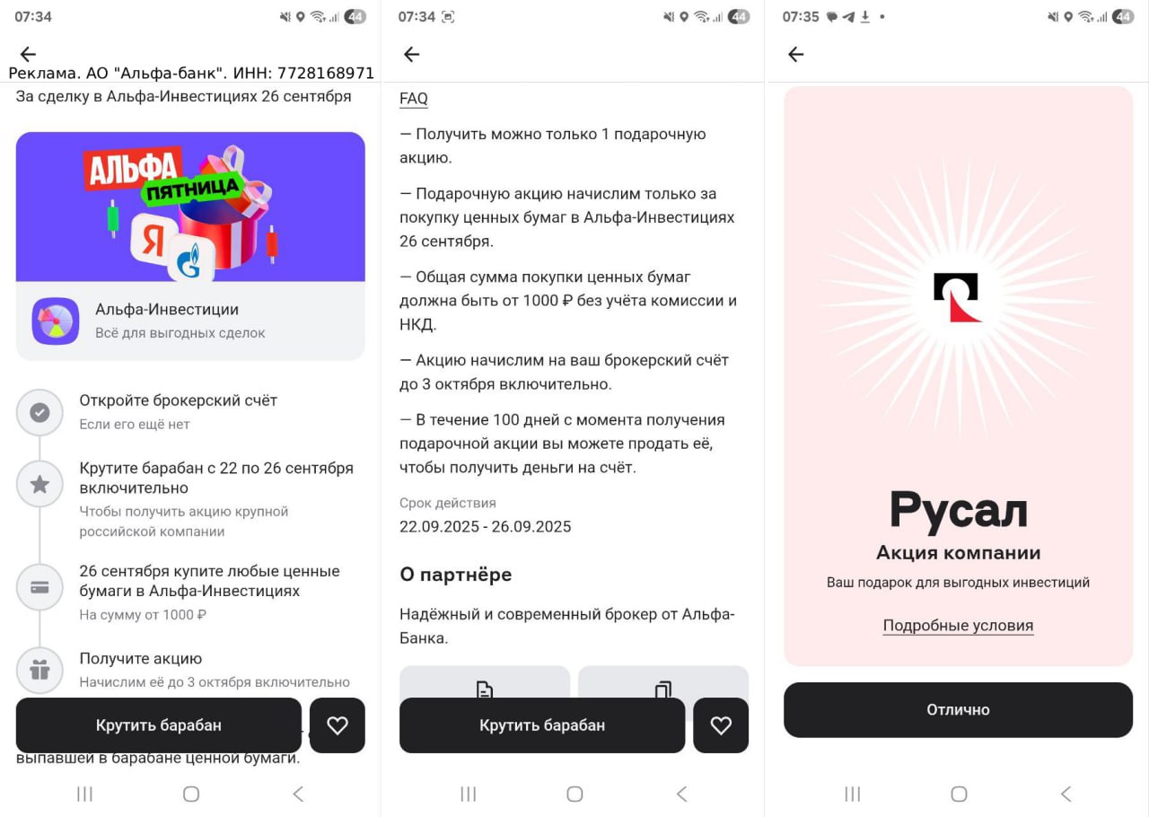 В приложении "Альфа-Банка" до 26 сентября можно крутануть специальный барабан "Альфа-Инвестиции" и выиграть подарочную акцию за покупку ценных бумаг 26.09.25 на сумму от 1000 руб.
