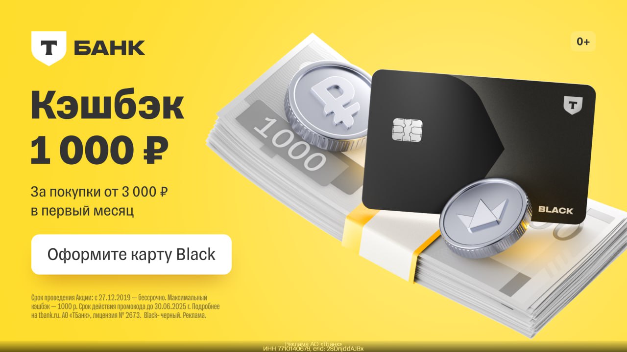 Если заказать карту Black от "Т-Банка" по этой ссылке и успеть потратить за месяц от 3000 руб., то банк подарит 1000 руб. Акция актуальна для клиентов, у которых минимум год не было дебетовых карт банка.