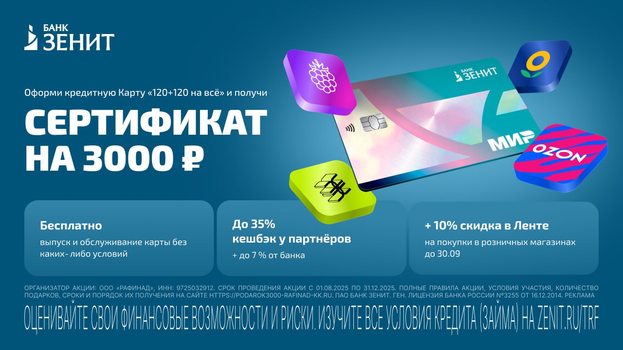 Если заказать бесплатную кредитную карту "120+120 ДНЕЙ НА ВСЁ" от Банка ЗЕНИТ по этой ссылке и в первые 30 дней потратить по ней от 500 руб. (не из списка исключений), то в подарок будет положен сертификат на 3000 руб. на выбор в OZON/WB/Золотое Яблоко/Ленту. Сертификат от партнёра (ООО "Рафинад") придёт в СМС/email в течение 60 дней.