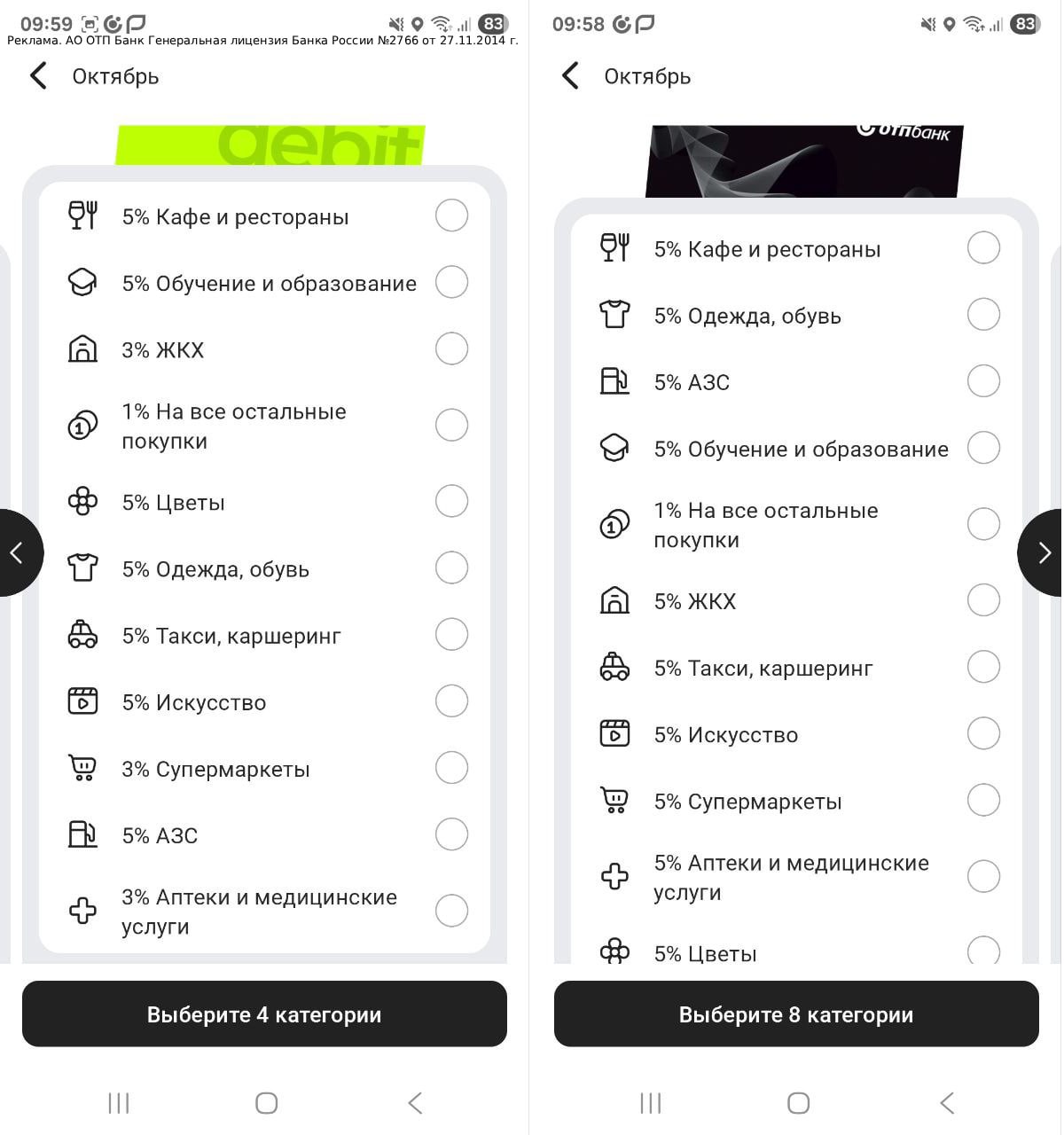 Список доступных категорий с 5% кэшбэка у всех одинаковый (единственное, в категориях "Супермаркеты", "Аптеки/Медицина", "ЖКХ" по "ОТП Карте" не 5%, а 3%):