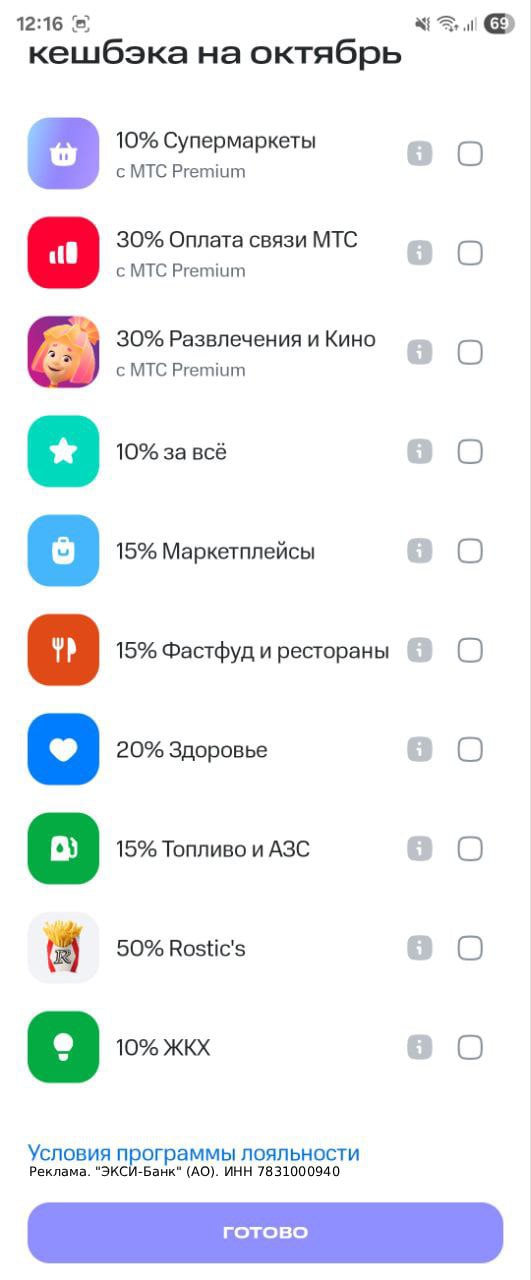 Хорошие категории по карте "МТС Деньги" от "ЭКСИ-Банка" (у всех примерно одинаковые, но процент кэшбэка разный). Топовая была бы карта, если бы кэшбэк не фантиками давали, а рублями.
