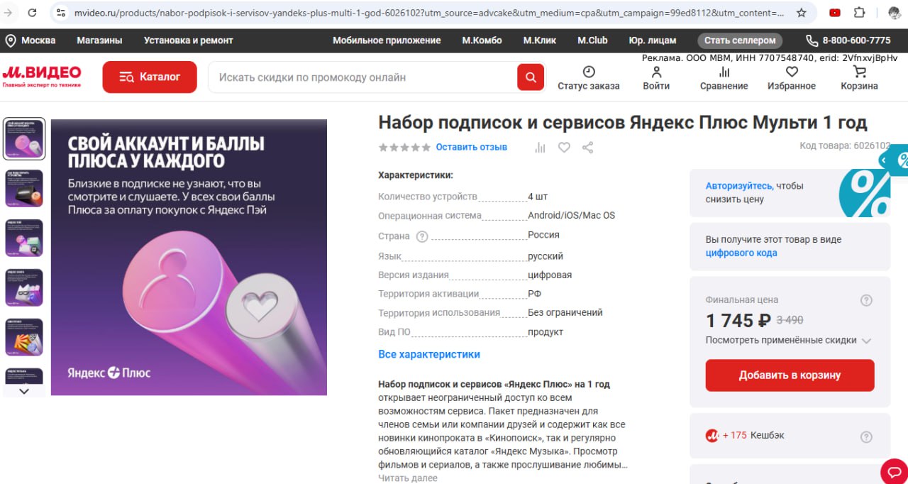 На сайте "М.Видео" в этом разделе предлагают подписку "Яндекс Плюс" на 12 месяцев за 1745 руб. (обычная её цена 399 руб./мес.).