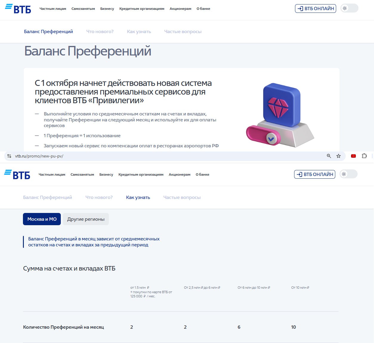 Количество начисляемых "Преференций" зависит от остатков за прошлый месяц (смотрят среднемесячные остатки на банковских счетах ВТБ + активы и ден. средства на последний день на брокерском счете, а также ПИФы, НСЖ, ИСЖ, ПДС которые оформлялись через ВТБ):