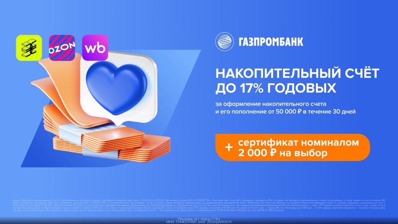 Если открыть "Накопительный счёт" от "Газпромбанка" по этой ссылке и пополнить его на сумму от 50 000 руб. в первые 30 дней, то в подарок будет положен сертификат на 2000 руб. на выбор в OZON/WB/Золотое Яблоко.