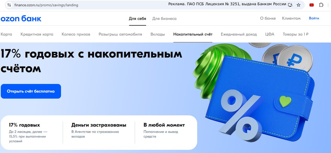 1️⃣ В "Озон Банке" по накопительному счету новичкам в первые два расчётных периода предусмотрена повышенная зафиксированная ставка — 17% годовых (с 18.11) на любой минимальный остаток за расчётный период. Повторно новичком не стать.