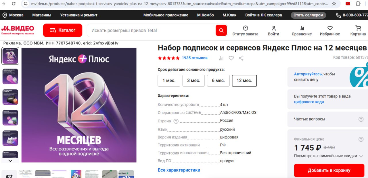 На сайте "М.Видео" в этом разделе предлагают подписку "Яндекс Плюс" на 12 месяцев за 1745 руб. (обычная её цена 399 руб./мес.).